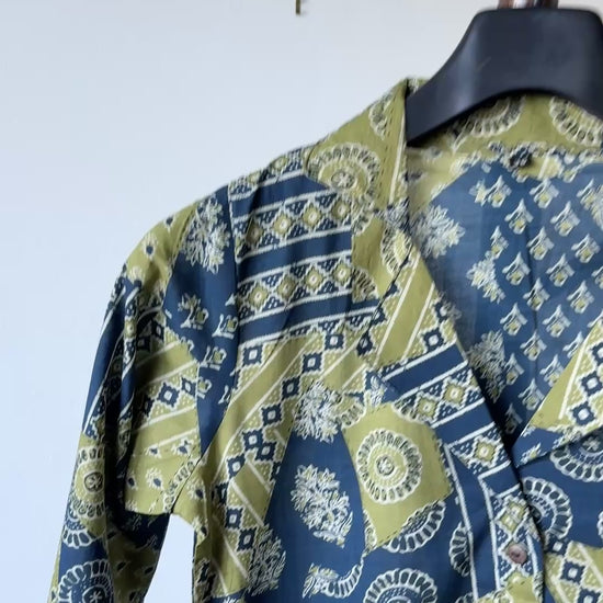 This is a handcrafted cotton shirt dress with a fabric belt. It features blue and olive block print in a patch-style design. and lots of flare! The collared neckline, button-down front, and long sleeves give it a timeless, relaxed look.