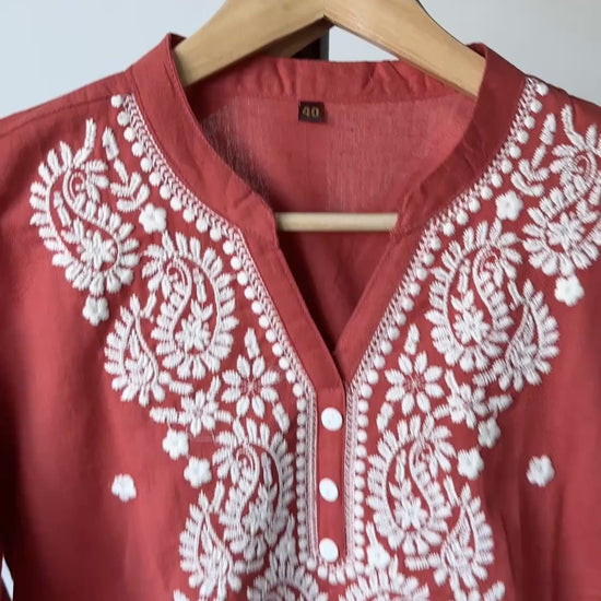 Embroidered Cotton Co-ord Set - Rust Red with White Threadwork
