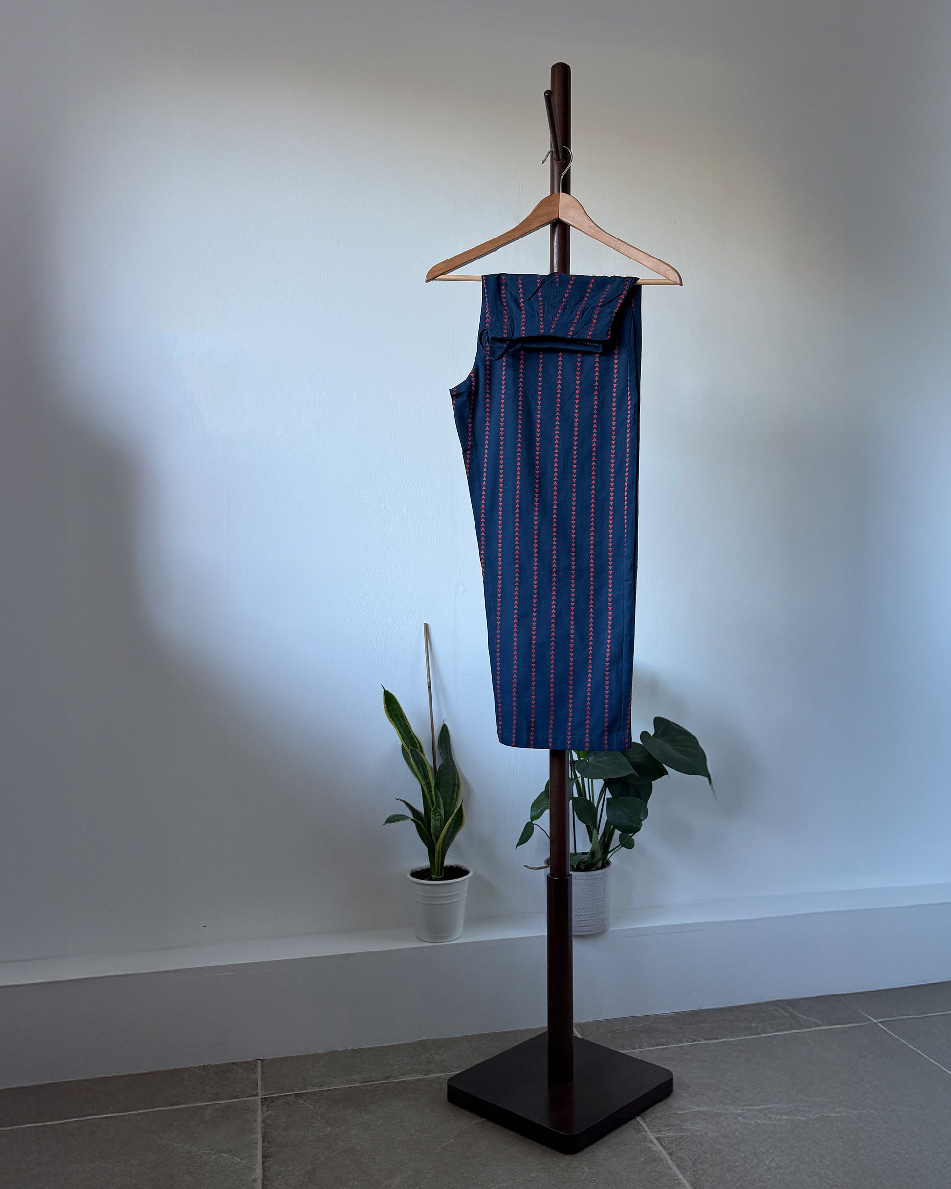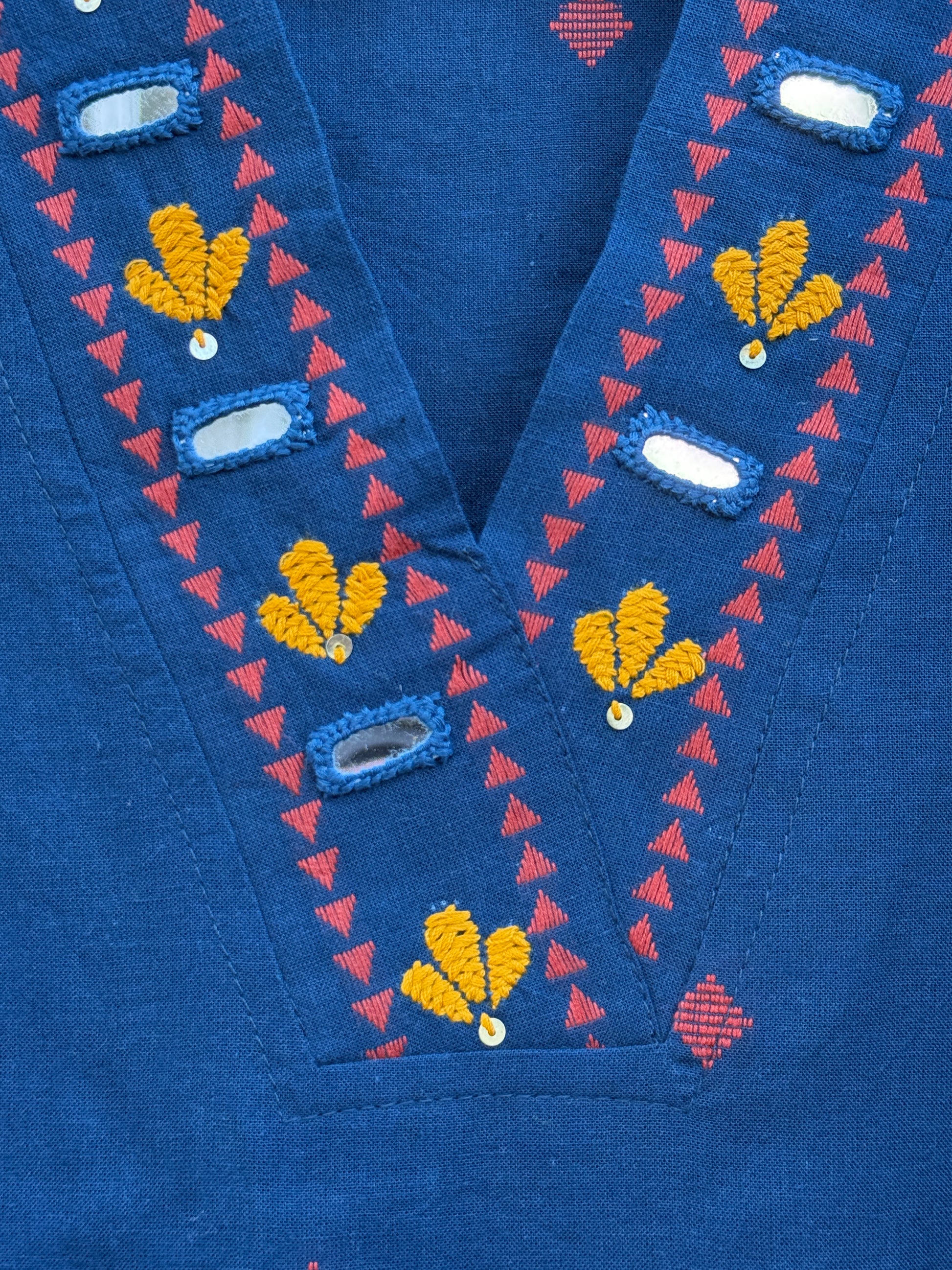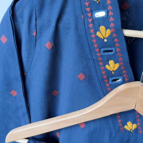 This elegant navy blue cotton kurta set is fresh out of a handloom in Gujarat, India. It has multicolour embroidery and mirror work along the neckline. Woven red motifs are scattered all over. It is paired with matching wide-leg striped cotton pants. This set is perfect for casual days or festive evenings.