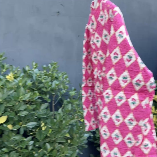 Make a statement with this handcrafted reversible quilted cotton jacket, featuring a vibrant pink diamond block print with floral details and a zigzag patterned inner side. Soft, breathable, and lightweight, it’s perfect for layering through all seasons.
