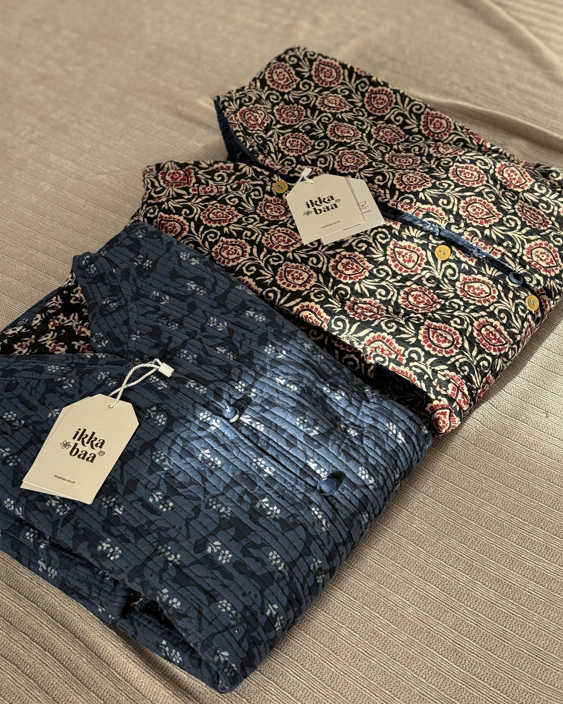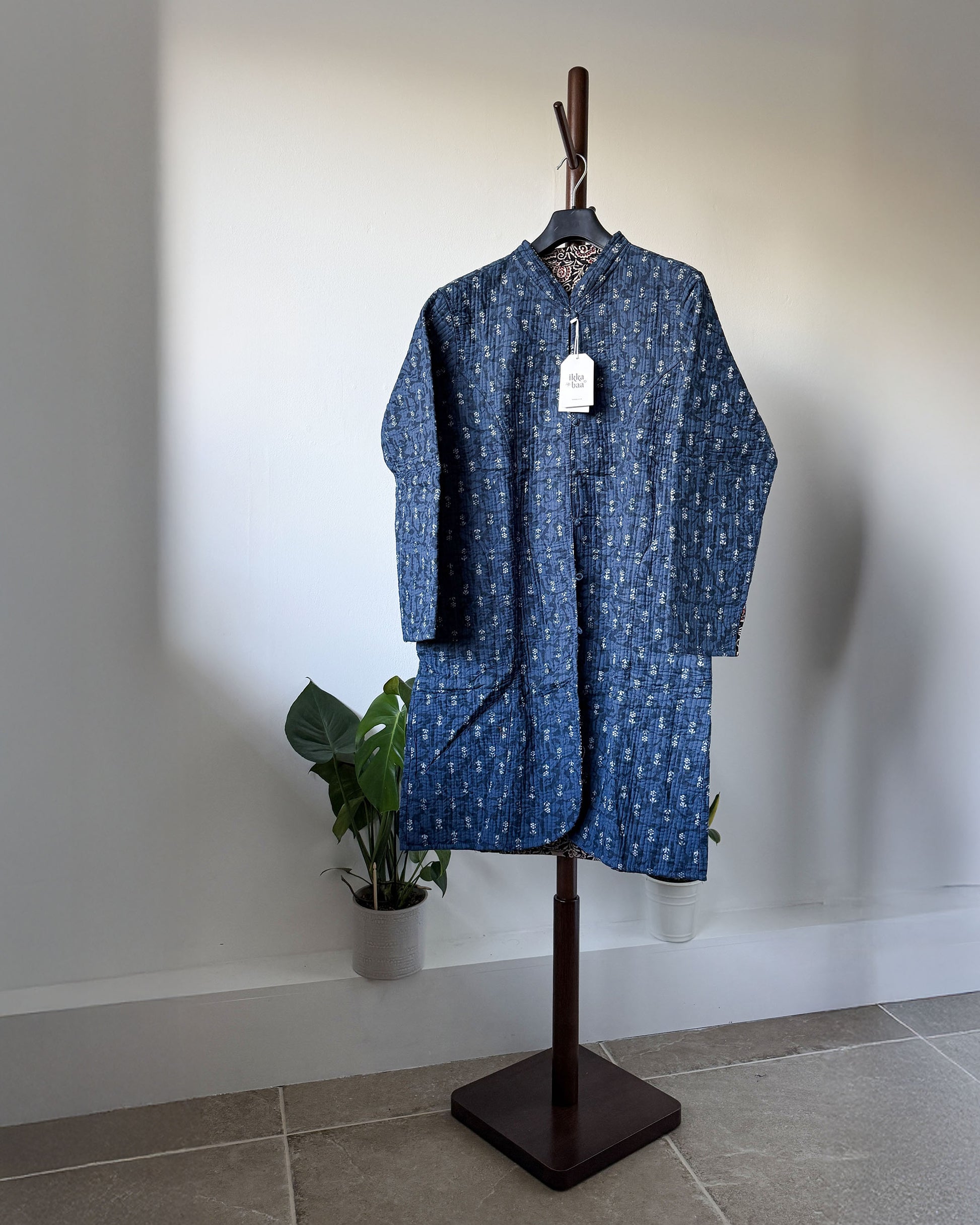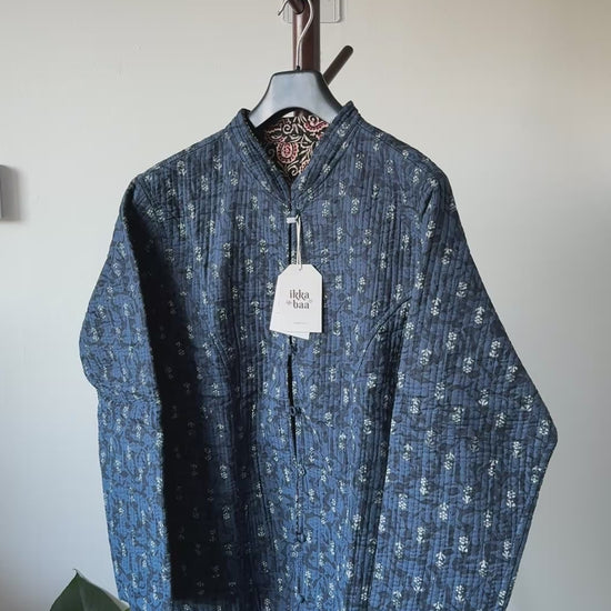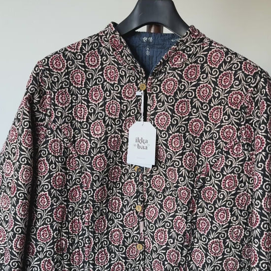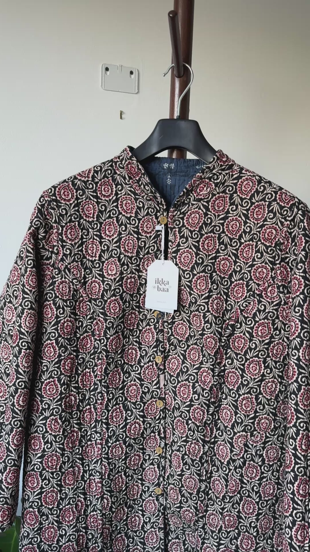 This handcrafted reversible quilted jacket features an elegant black base with red floral block print on one side and a contrasting indigo inner pattern on the other. It’s soft, lightweight, and perfect for layering. Includes two front pockets and buttoned down on both sides.